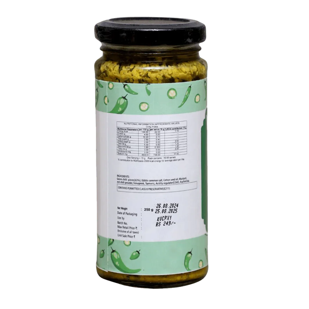 Our chilli pickle is perfect for spice enthusiasts who crave the heat. This pickle brings out the full flavour of fresh green chilies and spices, adding a fiery kick to any meal.